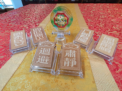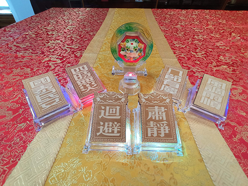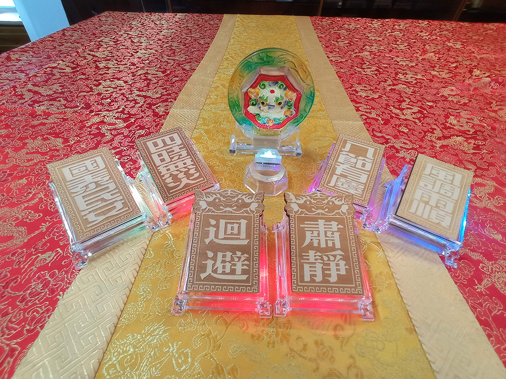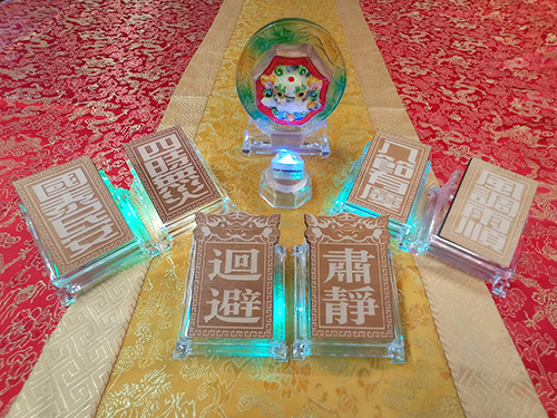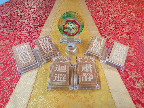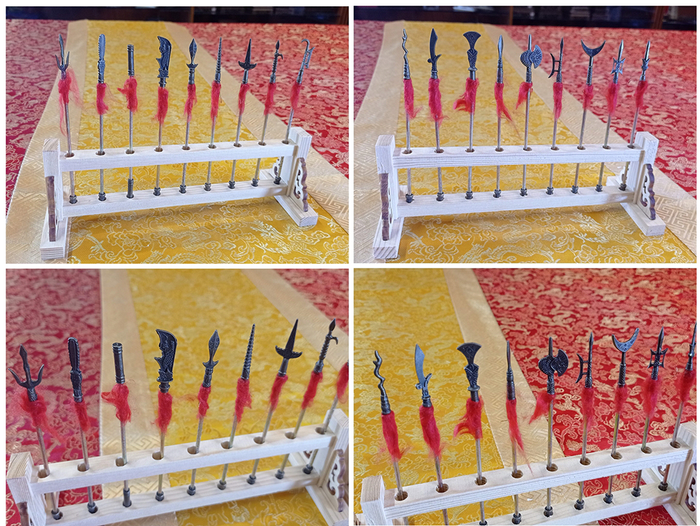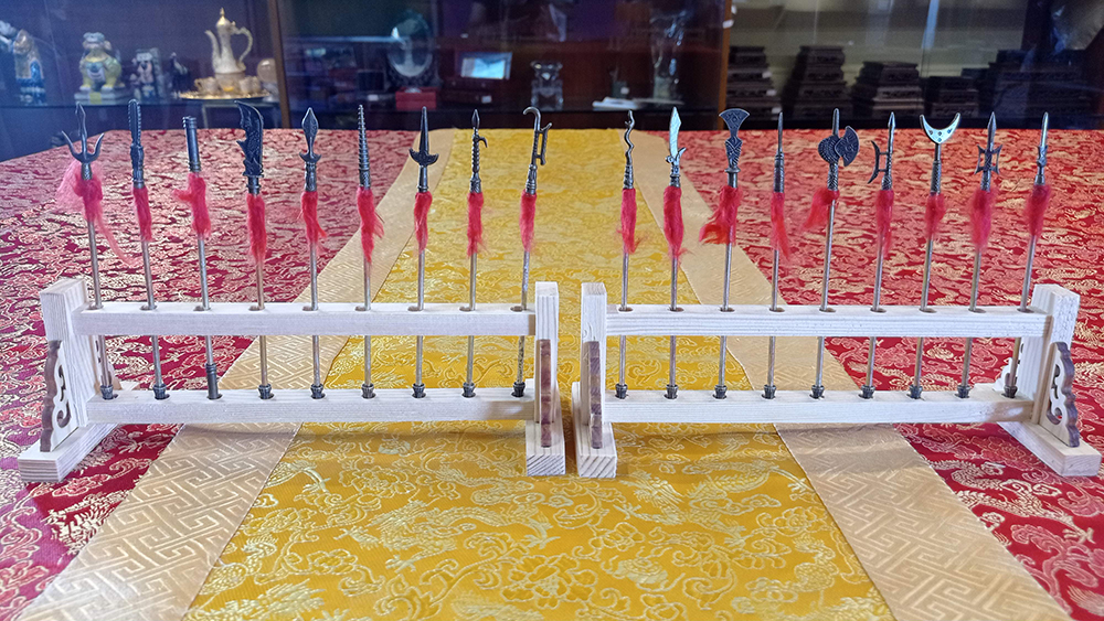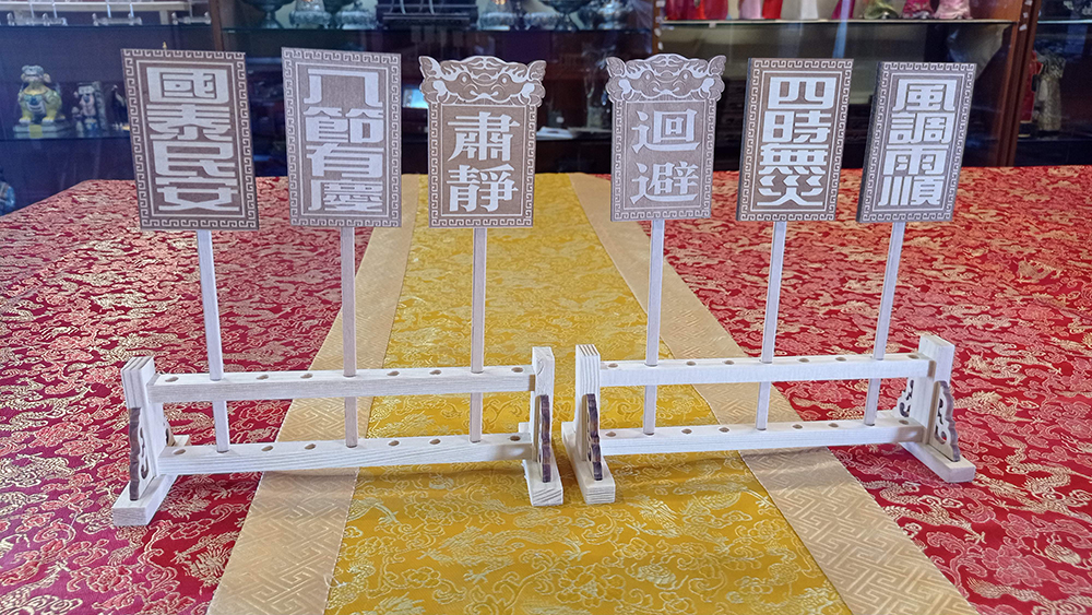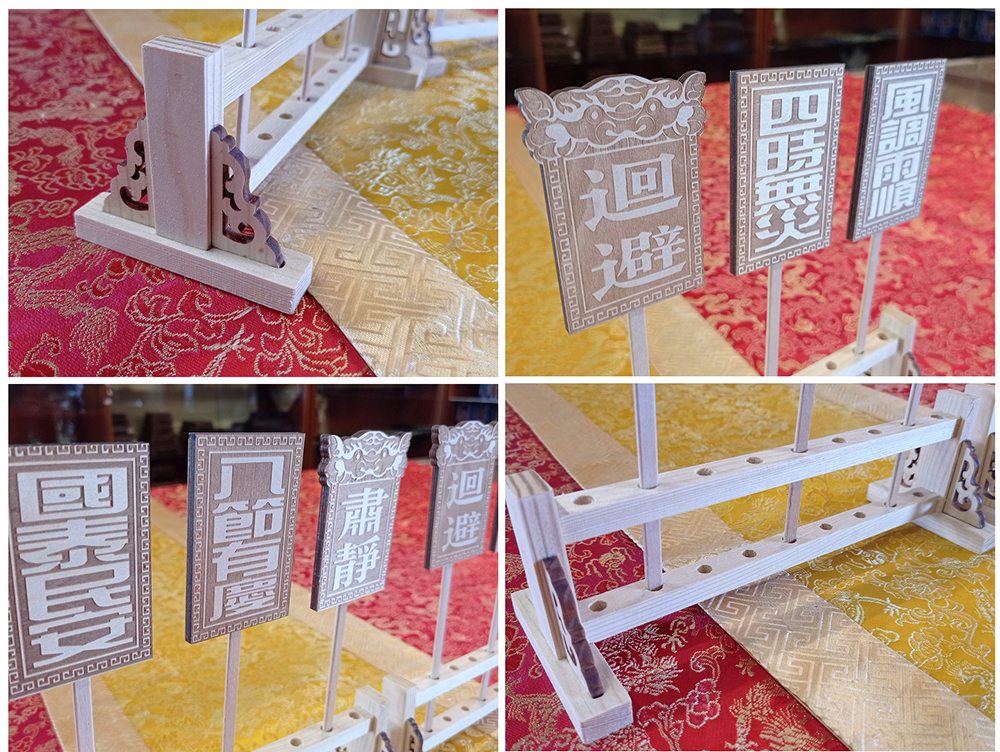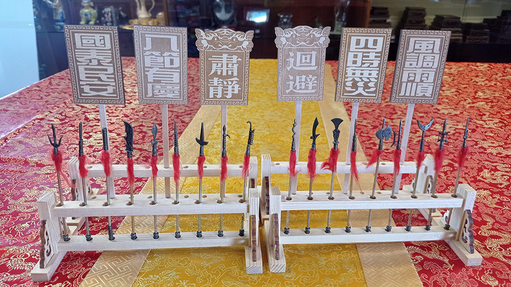 ----------------------------------------------------------------------- 實 木 肅 靜 迴 避 執 事 牌 兵 器 組 【木製肅靜牌六支 + 實木卡榫腳架兩個】 每套 700 元 商品編號 : W221 商品規格 : 腳架21.6*7.6*7公分,肅靜牌高約20.1公分 【銅合金十八般武器 + 實木卡榫腳架兩個】 每套 620 元 商品編號 : W222 商品規格 : 腳架21.6*7.6*7公分,十八般武器高約13公分 全套特惠價 只要 1280元 商品編號 : W223