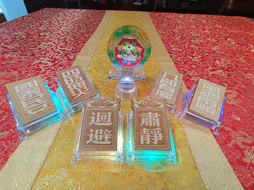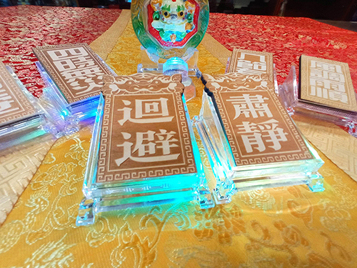 ----------------------------------------------------------------------- 八 卦 祥 獅 獻 瑞 七 彩 LED 燈 執 事 牌 【木製肅靜牌六個 + 八卦仿交趾陶祥獅 + LED燈】 商品規格 : 木製執事牌5*8公分,八卦祥獅10*13公分 全套特惠價 只要 1080元 商品編號 : W224