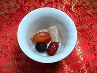 桂圓,冬瓜條,紅棗,金桔各一,桂圓需自行剝殼。 |